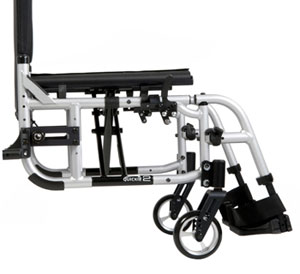 The Quickie 2’s new Swing-in/Swing-out hanger (pictured left) design features an intuitive bi-directional release lever that follows your hand’s movement and a tapered locking mechanism that prevents loosening over time. The Elevating/Articulating Legrest includes 2″ of height adjustment to better align with the knee joint for a natural motion. Audible clicks index its position as it is elevated. The new hemi frame that aligns with the seat rail, when combined with the new hemi hanger, allows for 1/2″ lower front seat heights.